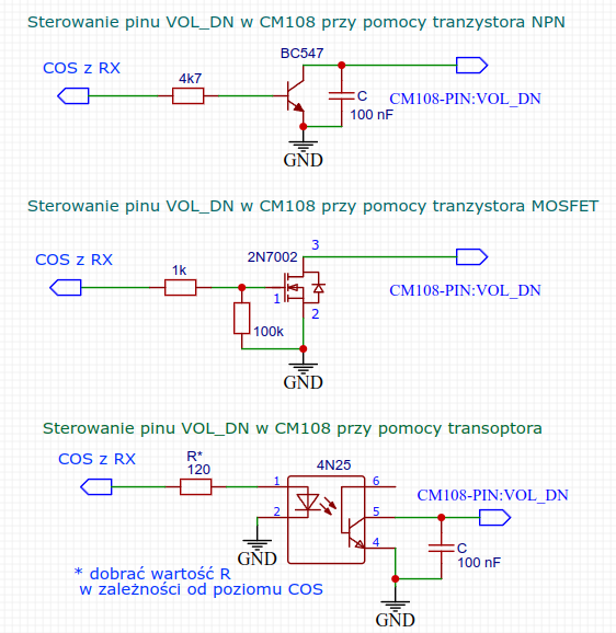 Sterowanie pinu VOL_DN w zmodyfikowanej karcie dźwiękowej CM108 może odbywać się za pomocą diody Schottky’ego (nie rekomendowane) lub poprzez tranzystora NPN lub transoptor. Rozwiązanie z tranzystorem powinno sprawdzić się w większości przypadków, ale kiedy mamy problem z włączaniem COS w CM108 bez uzasadnienia można rozważyć zastosowanie transoptora np 4N25. Poniżej schematy z wykorzystaniem z tranzystora lub transoptora. Schematy te zakładają, że otwarcie blokady odbiornika jest stanem HIGH-wysokim np 5V a zamkniecie blokady odbiornika jest stanem 0V.