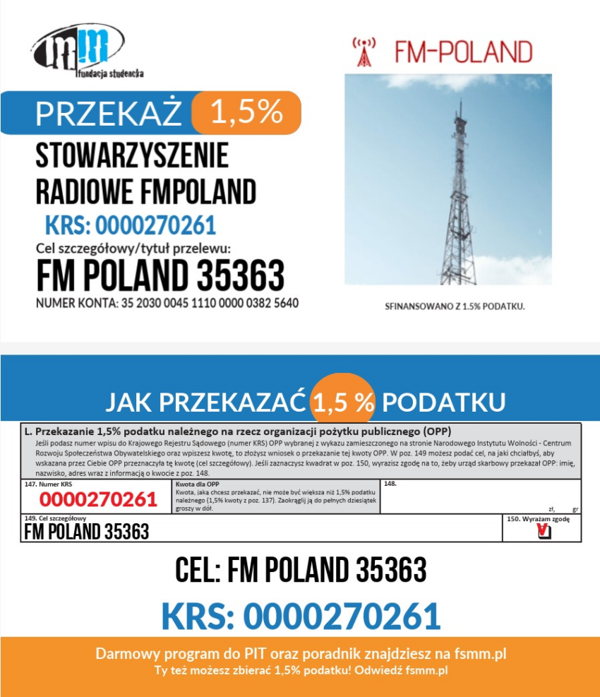W formularzu PIT wpisz numer KRS Fundacji: 0000270261 oraz w polu „Cel szczegółowy” dopisz: FM POLAND 35363.